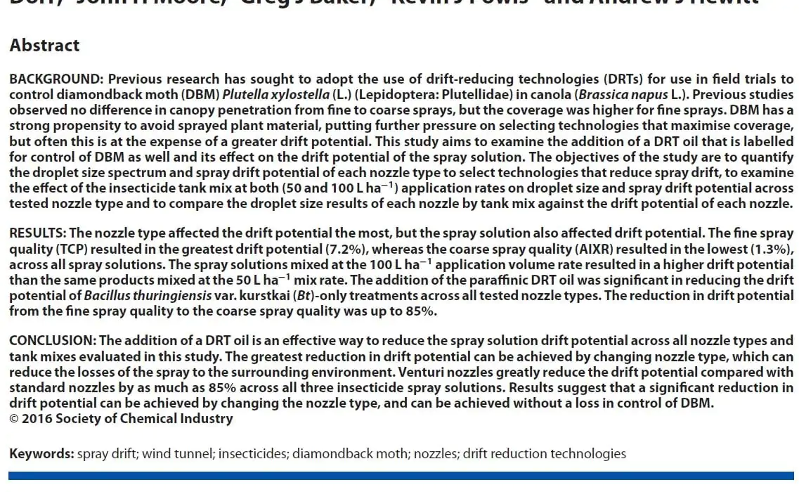 Os objetivos do presente estudo foram quantificar o espectro de gotas e o potencial de deriva de cada tipo de pontas para selecionar tecnologias que reduzem a deriva e avaliar o efeito das misturas em tanque com inseticidas nas taxas de aplicação de 50 e 100 L ha‾¹. As conclusões mostram que a adição de óleo como técnicas de redução de deriva (TRD) foi eficiente na redução do potencial de deriva em todas as pontas e misturas em tanque avaliada no estudo. A maior redução da deriva pode ser encontrada mudando o tipo de ponta. Pontas do tipo Venturi obtiveram a maior redução de deriva comparadas as pontas padrão. Os resultados sugerem que uma redução significativa no potencial de deriva pode ser alcançada com a mudança do tipo de ponta sem comprometer o controle do alvo.
