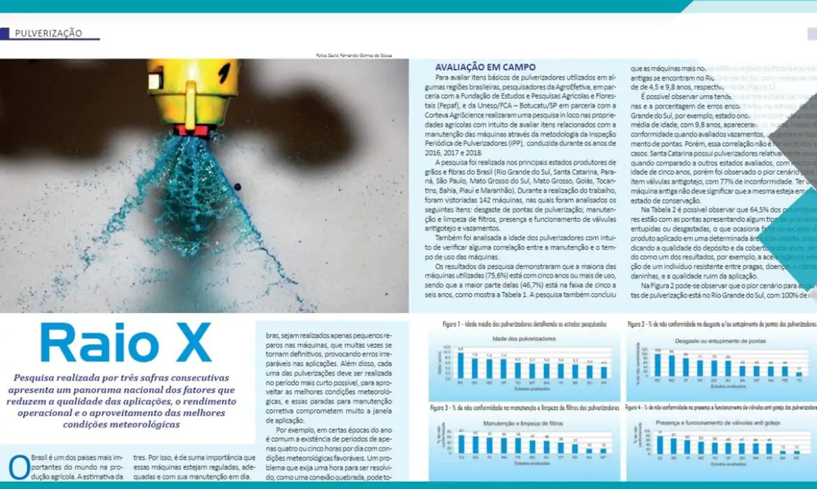 O Brasil é um dos países mais importantes do mundo na produção agrícola. A estimativa da produção na safra 2018/19, segundo a Conab (2019), é de 235,3 milhões de toneladas, um crescimento de 3,4% em relação à safra anterior. No entanto, para manter essa produtividade é necessário um manejo correto das culturas, em que podemos destacar a aplicação de defensivos agrícolas. Destas aplicações, pelo menos 75% são realizadas com pulverizadores terrestres. Por isso, é de suma importância que essas máquinas estejam reguladas, adequadas e com sua manutenção em dia.