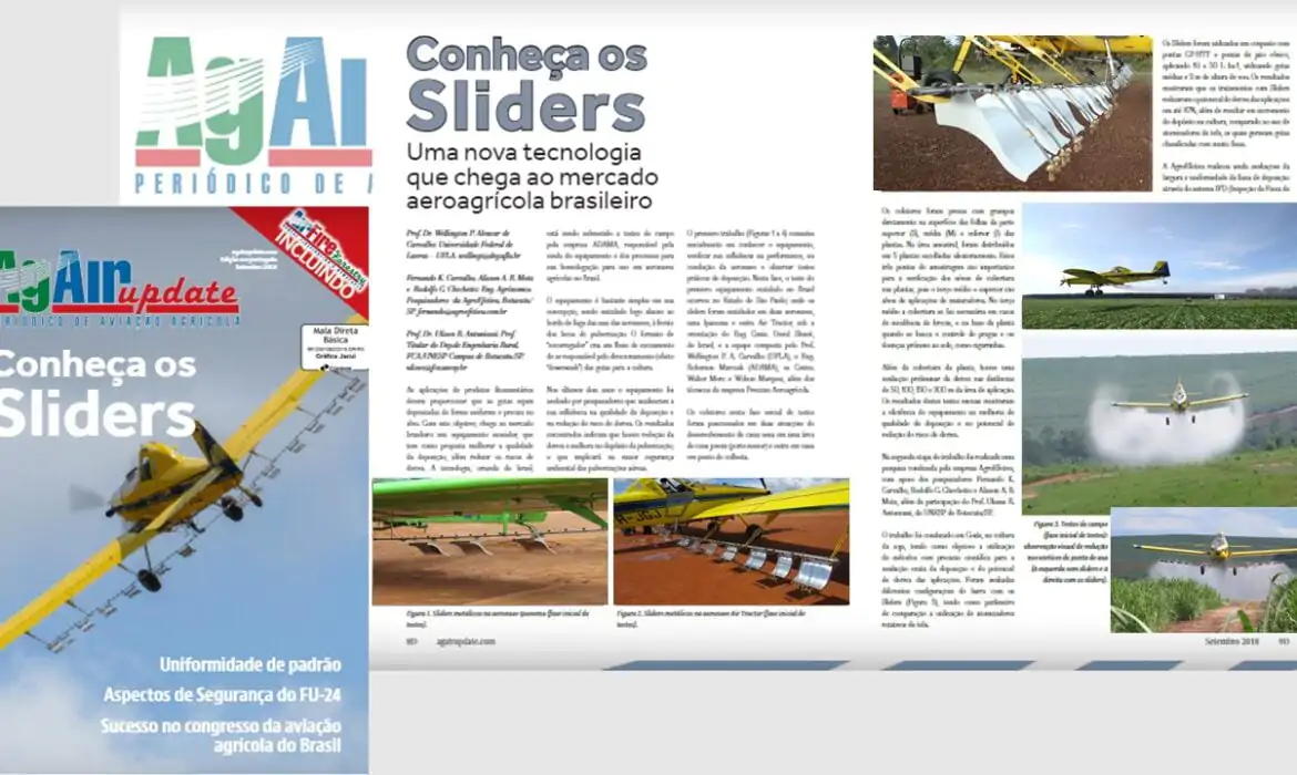 Os sliders, nova tecnologia que chega ao mercado brasileiro, que tem como proposta melhorar a qualidade da deposição, além reduzir os riscos de deriva. A tecnologia, oriunda de Israel, está sendo submetido a testes de campo pela empresa ADAMA, responsável pela vinda do equipamento e dos processos para sua homologação para uso em aeronaves agrícolas no Brasil.